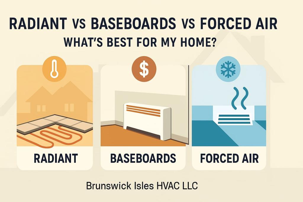 Ready to choose confidently? Contact Brunswick Isles HVAC LLC for a right-sized, future-proof heating plan—whether that’s silky-smooth radiant floors, simple baseboard zoning, or a high-efficiency forced-air system that handles heating, cooling, and clean air in one.